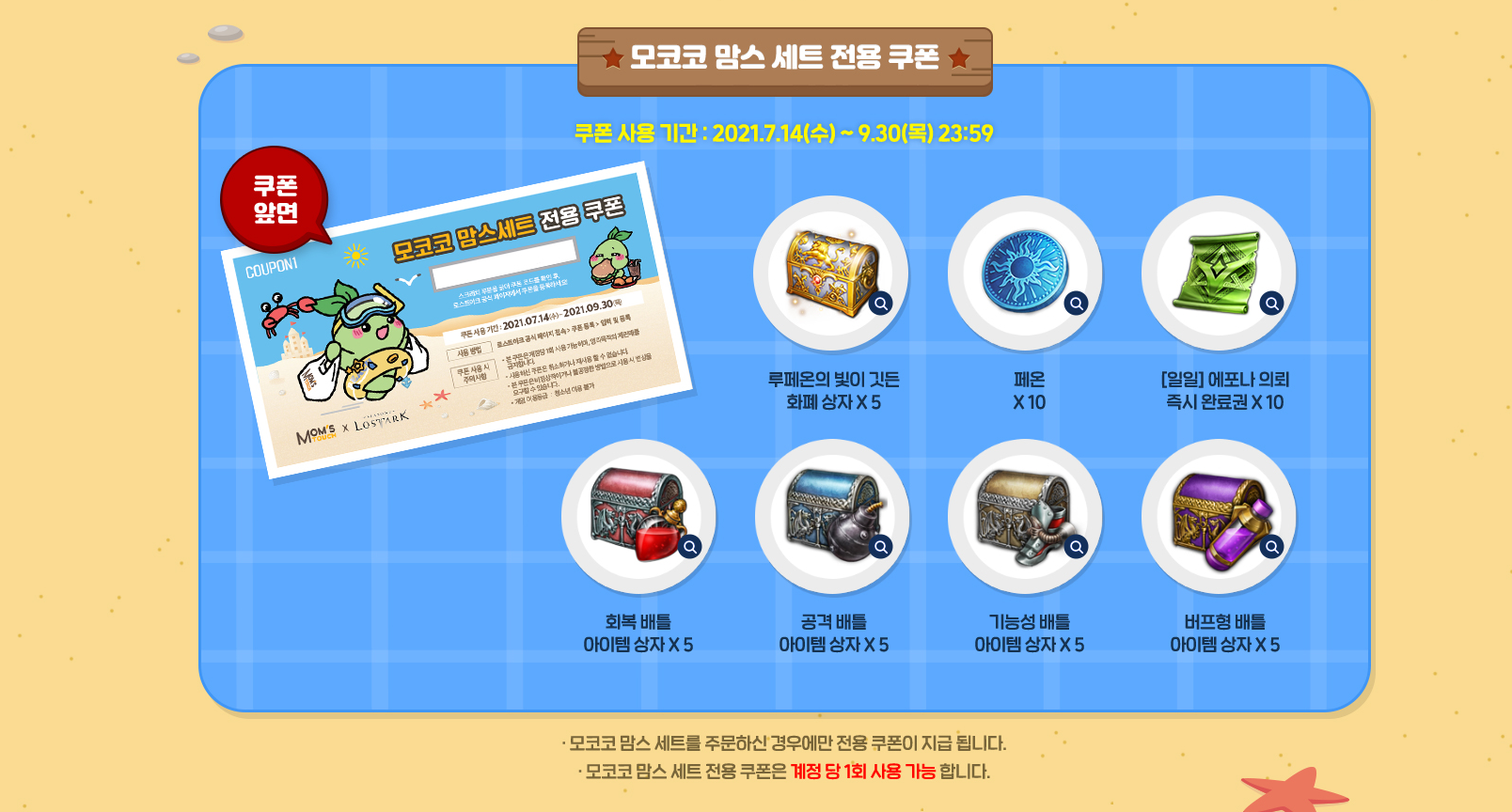 | 유의사항 | * 매장 상황에 따라 모코코 쿠폰은 조기 소진 될 수 있으며, 본 세트는 조기 판매 종료 될 수 있음 * 해당세트 구매시 증정되는 쿠폰은 계정당 1회 사용 가능하며, 영리목적의 재판매를 금지합니다. * 사용하신 쿠폰은 취소하거나 재사용 할 수 없습니다. |